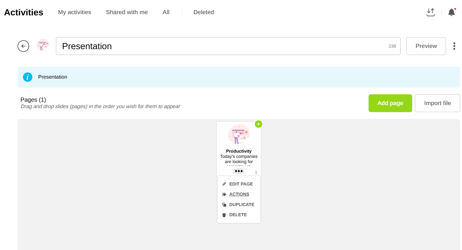 Ajoutez une activité à une slide : Dans l'encart Activités, cliquez sur l'icône de l'activité souhaitée, puis sur le menu "3 petits points"