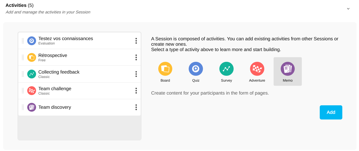 Structurer votre Session : Les activités peuvent vous aider à organiser votre Session et à guider vos participants à travers les différents sujets que vous souhaitez aborder