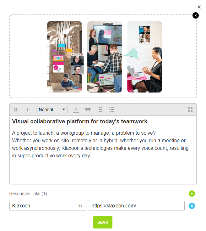 La section "Lien des ressources" dans Klaxoon est un atout précieux pour enrichir vos sessions. Elle vous permet d'intégrer des liens URL vers des pages web, offrant ainsi un accès direct à des informations complémentaires pour vos participants.