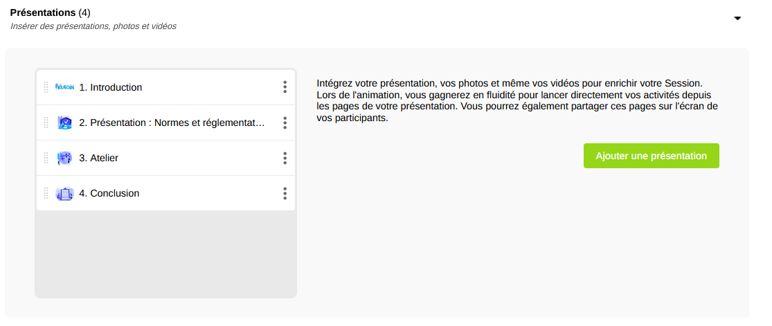 Il est possible d’ajouter plusieurs présentations à une session sur l’écran d’édition dans "Activités".