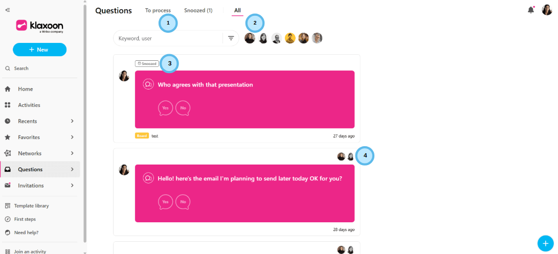 Les photos de profil de chaque membre ayant reçu la question sont affichées. Une coche rose indique qui a répondu.