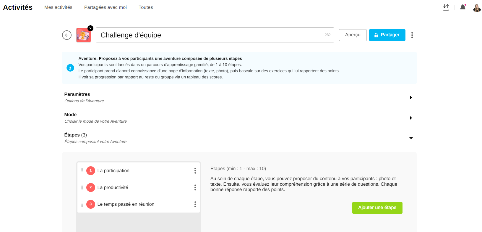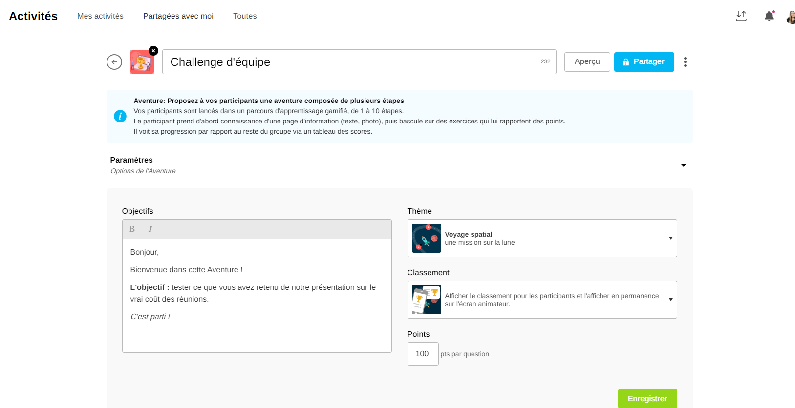 Objectifs : saisissez un descriptif qui sera indiqué aux participants au début de l'activité