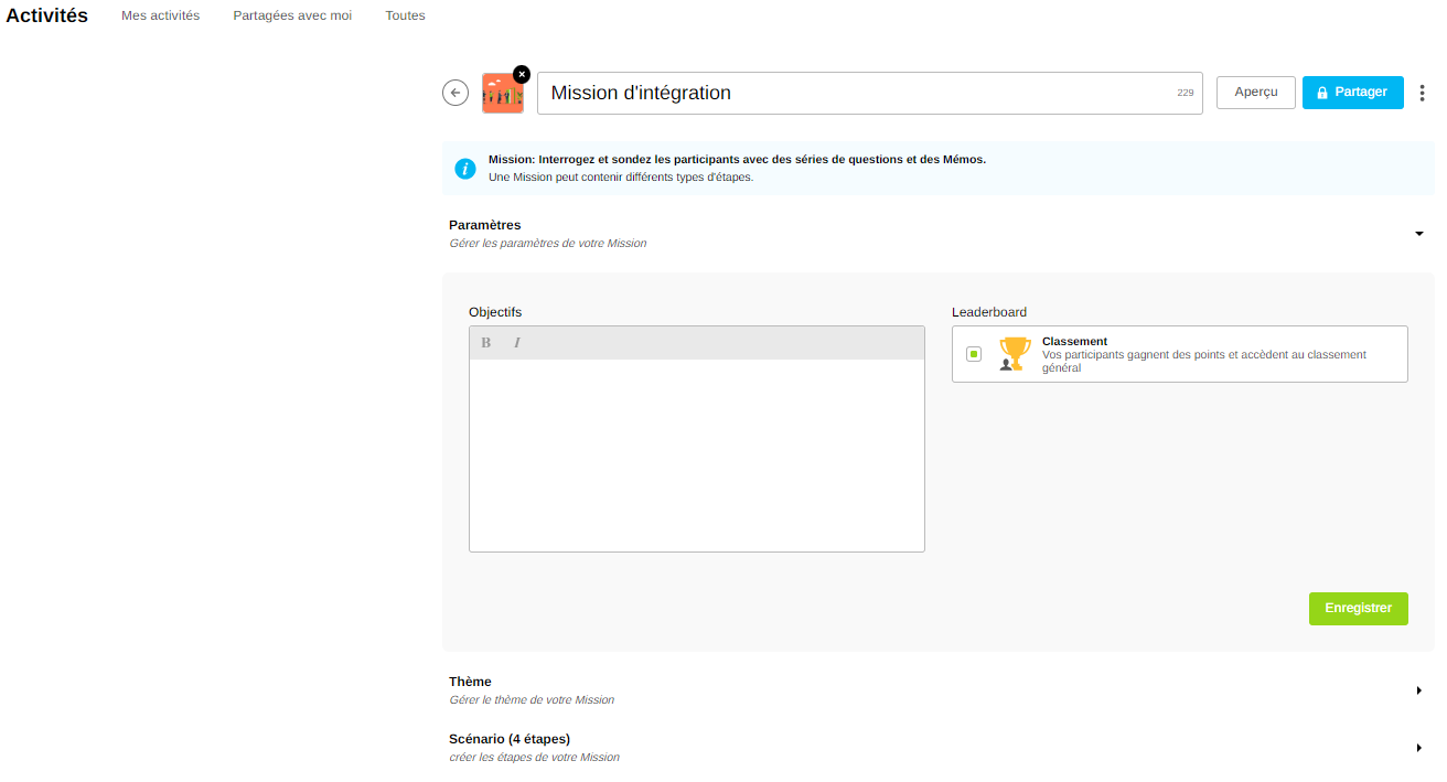 Objectifs : saisissez une description qui sera affichée aux participants au début de la Mission.