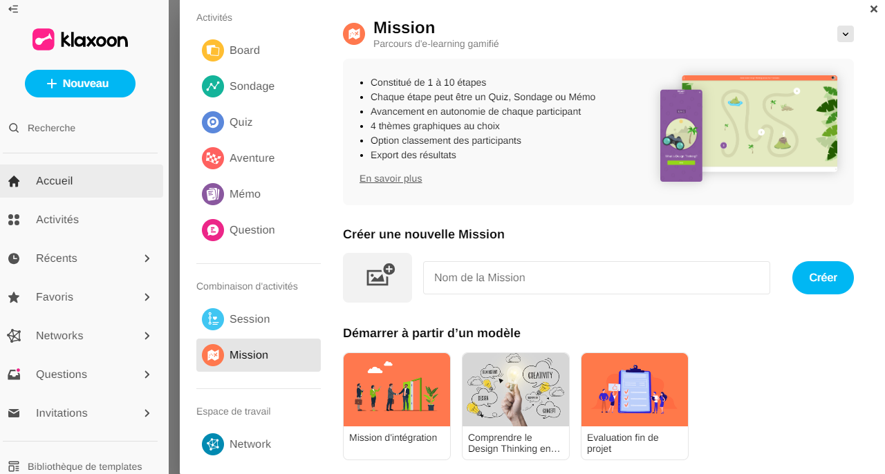 Dans la page d'accueil de Klaxoon , cliquez sur NOUVEAU puis sur MISSION.