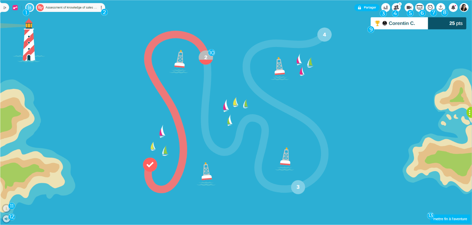 Le tableau de bord d'une Aventure lancée dans une Session fournit une vue en direct de la progression des participants et de leurs résultats au quiz une fois qu'une étape est complétée par tous les participants.
