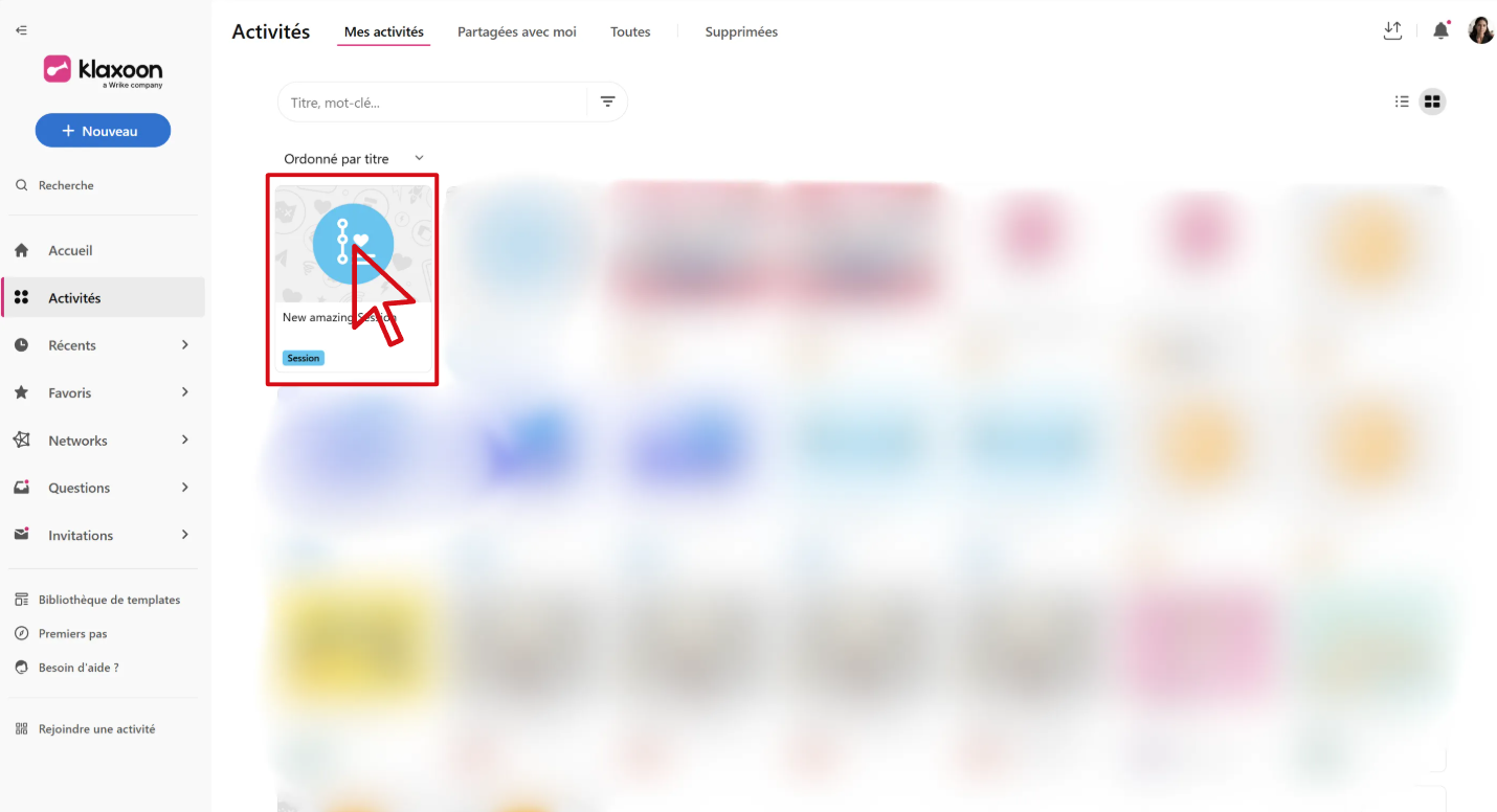 Depuis votre tableau de bord Klaxoon, repérez la Session concernée. Cliquez sur son nom pour l’ouvrir.