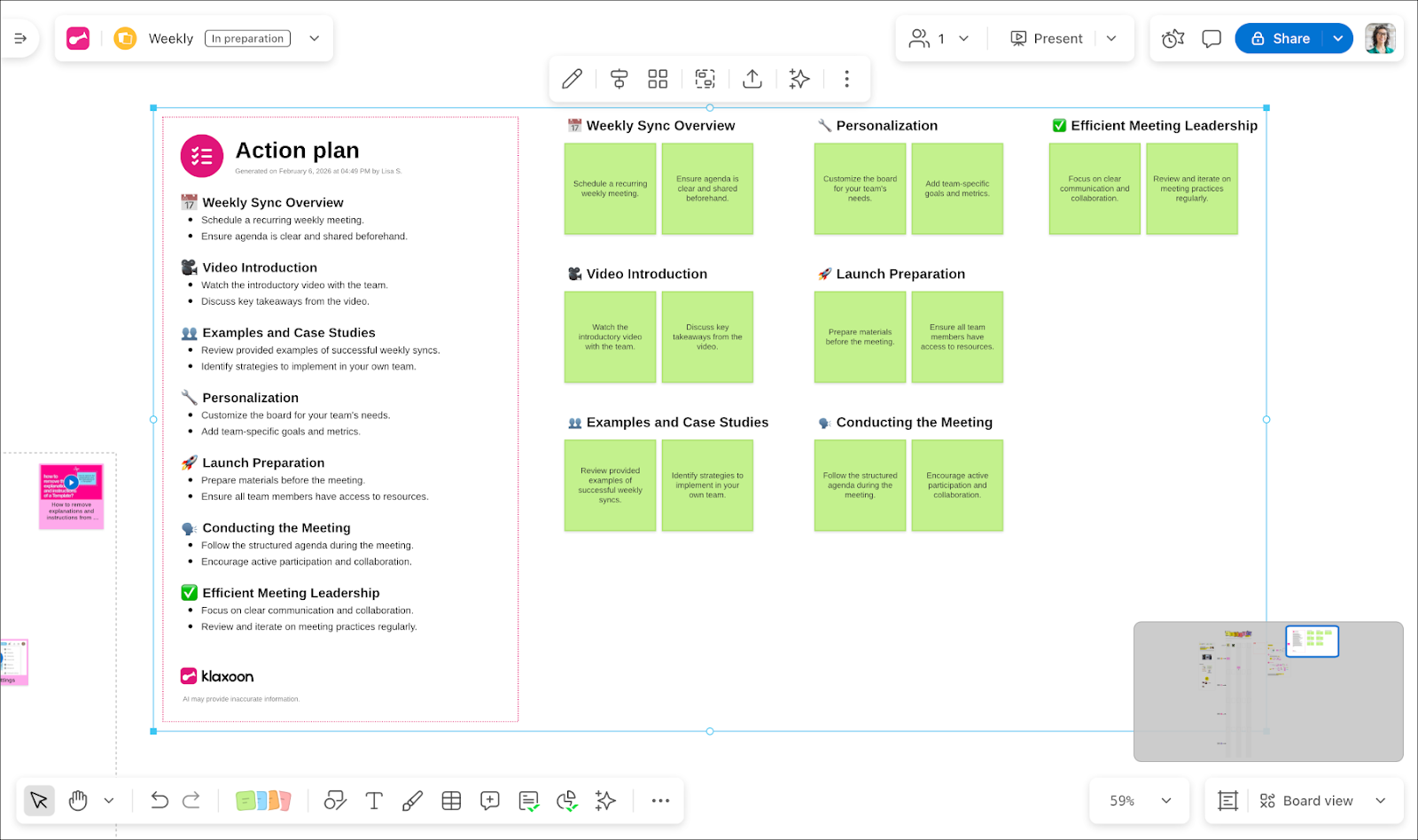 Le résultat de l’IA apparaît sous forme de carte composée d’objets Board éditables, groupés pour que vous puissiez facilement la déplacer sur le Board. Un duplicata du plan d’action est également créé en tant qu’idée Board afin que vous puissiez commencer à travailler avec ces actions immédiatement. L’en-tête indique la date, l’heure et le nom de la personne ayant lancé l’analyse IA.