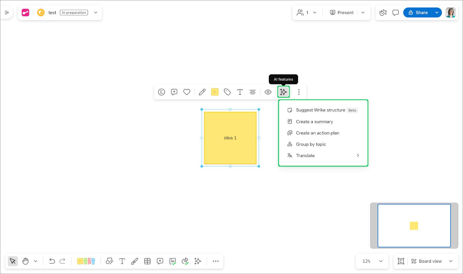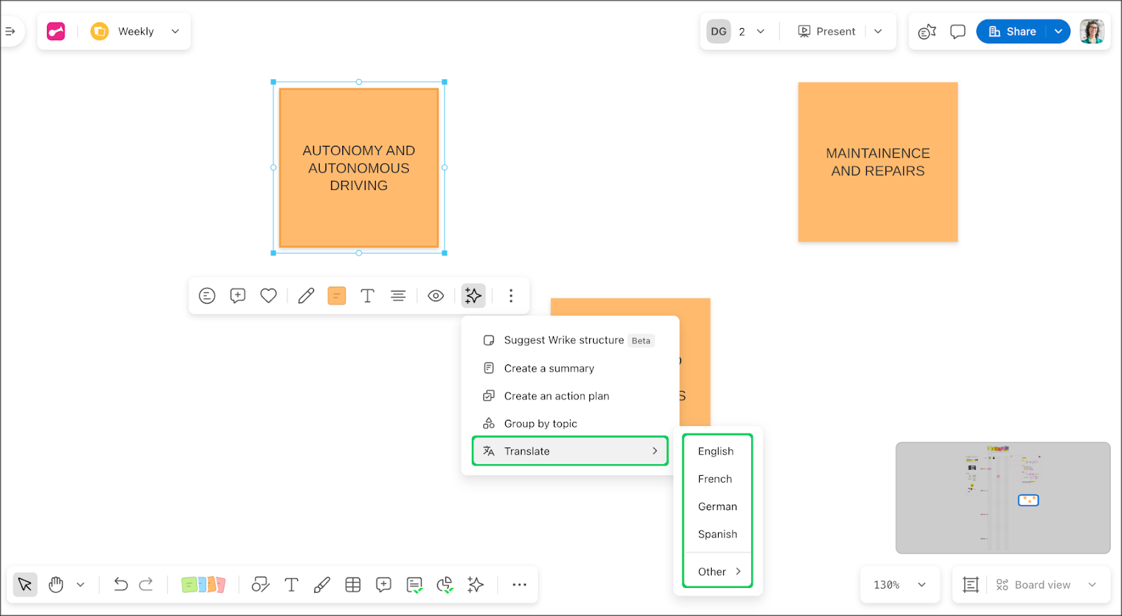 Utilisez l’IA sur les Boards pour travailler plus rapidement et tirer davantage parti de vos idées. Vous pouvez créer des résumés courts, regrouper des éléments par thème et générer des plans d’action. Les résultats de l’IA sont automatiquement formatés et prêts à être utilisés sur le Board ou pour l’exportation.